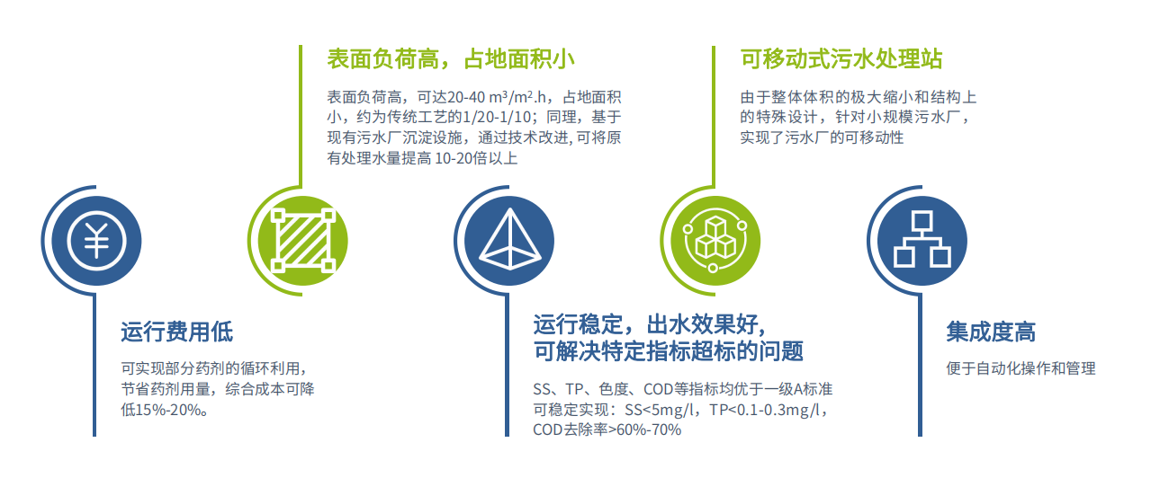 磁混凝沉淀一體化設(shè)備,主要工作原理是依據(jù)重介質(zhì)加載沉淀原理,通過向污水中投加適量可循環(huán)利用的磁種,并使磁種均勻分散到水體中形成微小晶核,以此強(qiáng)化絮凝效果,并最終形成高密度絮凝體(磁種密度為水密度的5.1倍),依靠重力作用和斜管(板)沉淀原理實現(xiàn)固液的高速沉淀分離。同時輔以部分污泥回流系統(tǒng)以增強(qiáng)去除效果和降低藥劑費(fèi)用。