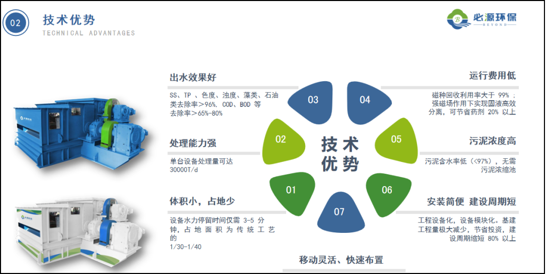 該技術(shù)是通過向惰性污水中投加可循環(huán)利用的磁種,并在混凝劑和絮凝劑共同作用下形成磁絮凝體,然后利用稀土永磁磁盤產(chǎn)生的強(qiáng)磁場作用(磁力強(qiáng)度是其自身重量的600多倍),在瞬間(約2秒鐘內(nèi))實(shí)現(xiàn)污水固液分離的過程,來達(dá)到消除污水中絕大部分污染物的目的。